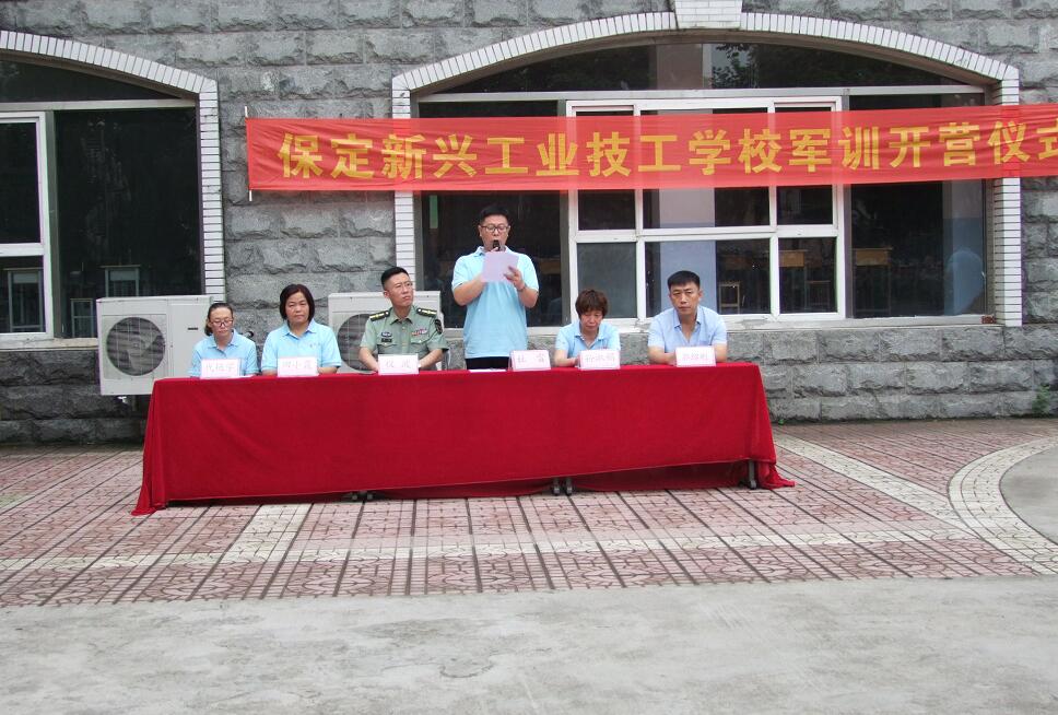 8月5日上午, 保定新兴工业技工学 校 2020年秋季级学生军训开营式在校篮球场举行。石家庄财经职业学院武装部部长兼工会主席仪波、学校副校长杜雷、孙淑娟、田晓霞、郭绍刚,招生
